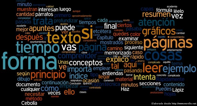 Supón que se trata de un tema de 30 páginas con texto únicamente aunque, si hay gráficos y encima a color, mucho mejor porque vas a ir mucho más rápido, ya que, tu cerebro va a asimilar a una velocidad muy superior aquéllo que procesa en forma de dibujo (a color) que lo que tiene que leer para luego formar la imagen mental.