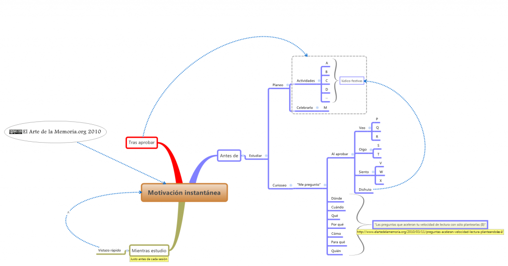 Puedes imprimirlo y completarlo o, mejor, puedes utilizarlo como modelo para elaborar tú mism@ tu Mapa Mental de motivación instantánea. Cuantos más colores y más dibujos e imágenes incluyas, más rápidamente va a provocar que tu motivación aumente. Aunque en realidad, lo que en realidad influye es el contenido y el efecto que provoca en ti. Es decir, las actividades que planeas hacer cuando apruebes, el modo de celebrarlo, lo que experimentarás sensorialmente al aprobar (ver, oír, sentir, …)